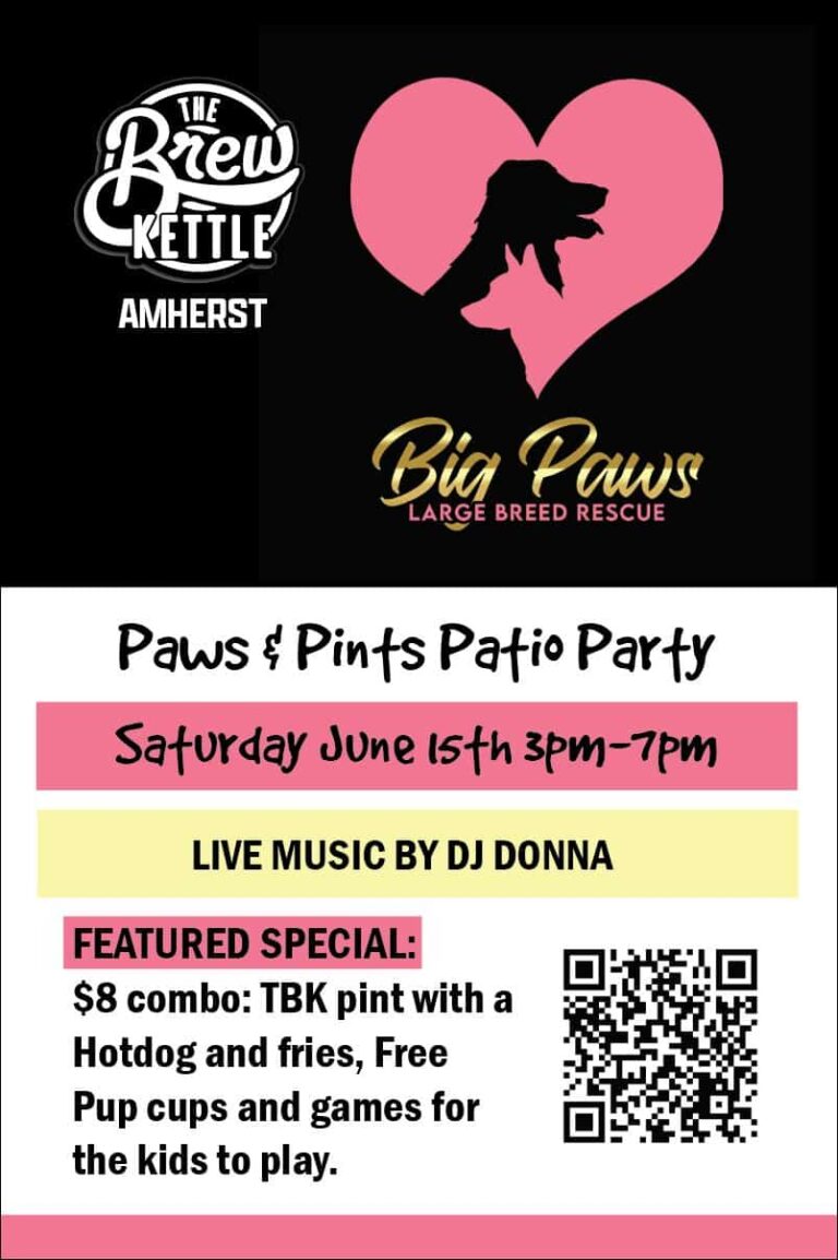 Paws & Pints Patio Party, Saturday June 15th 3pm-7pm. Live music by DJ Donna